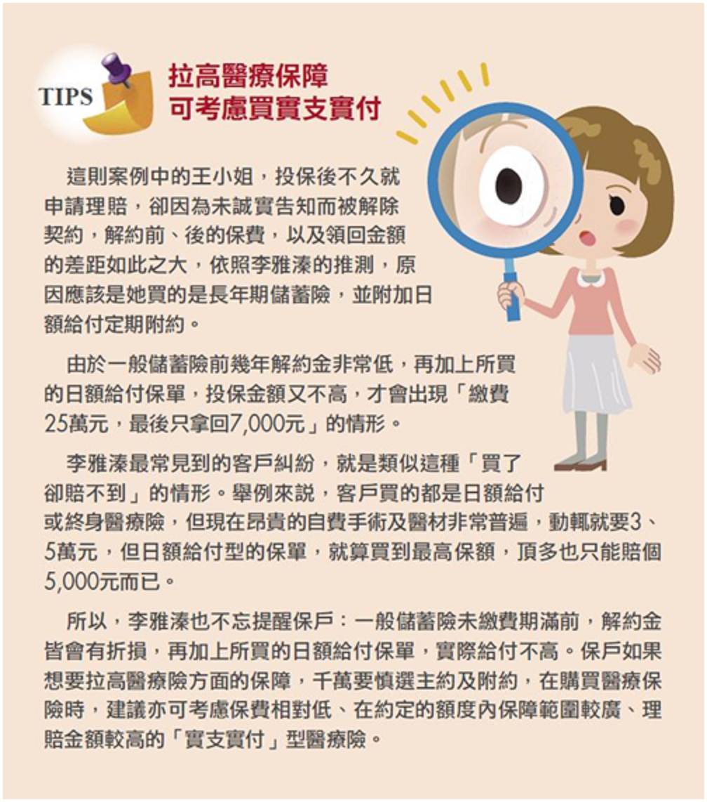 不僅如此,中華郵政還以違反《保險法》第 64 條「要保人違反據實說明義務」的規定, 將王小姐的保單取消。最後,王小姐的保單不但遭到解約,連之前總共繳納約25萬元的保費 也只拿回7,000元王小姐向中華郵政投保的過程中,到底出了什麼問題?